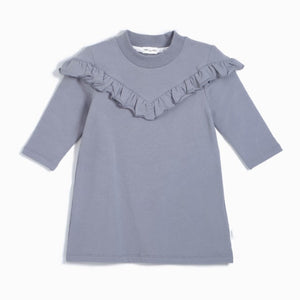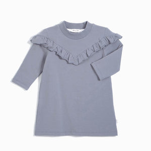 This silver mauve dress has a vintage style and ruffle trim around the shoulders. The fleecy composition is perfect for pairing with tights and boots to keep warm and snug on a chilly day. Made with a breathable organic cotton, it is soft on their skin while giving them the freedom to play, dance and explore throughout the day.